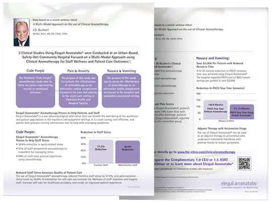 The consistent amount of essential oils in Elequil Aromatabs aromatherapy makes them ideal for clinical studies. Many healthcare facilities have utilized Elequil Aromatabs aromatherapy to determine the effects of clinical aromatherapy on patient anxiousness, patient perception of pain, patient ability to complete an exam without intervention, and even staff-related stress.